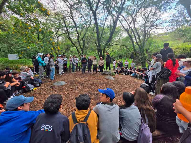 Un público en su mayoría colegial aprende sobre el río en una minga de enero 2026 en el río San Pedro; muchos adolescentes lo vieron aquí por primera vez. Antes de reflexionar han compartido el trabajo y la comida con los adultos.